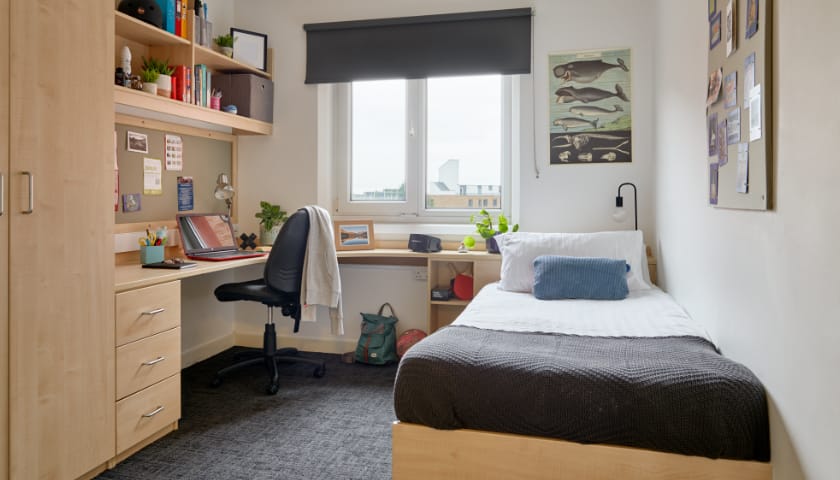There are two different styles of en suite rooms in our postgraduate accommodation. Those with a 'wet room' (tiled shower room with washbasin and WC) have a standardised layout, with typically eight students sharing a communal kitchen. Some slightly older accommodation blocks have an en suite with a shower cubicle, washbasin and WC. These rooms and flats were designed to different layouts and specifications, and this is reflected in the lower price.