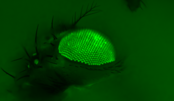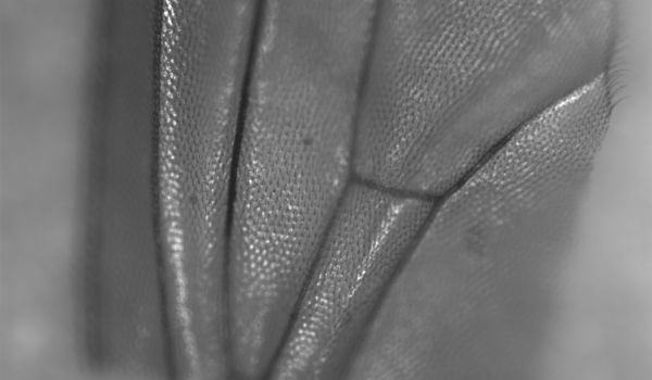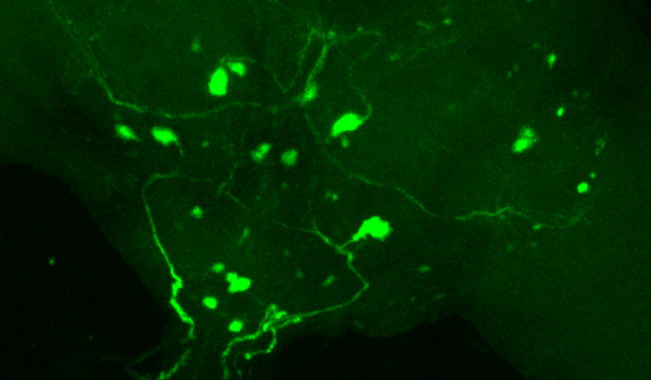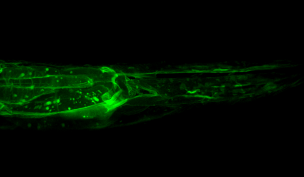 Adult Caenorhabditis elegans roundworm head (top, anterior side to the left) and tail (bottom, posterior side to the left) labelled with a fluorescently-tagged extracellular matrix protein, revealing the lining of its internal organs. False-colour image acquired with a monochrome camera by confocal fluorescence microscopy at 400x magnification. Image provided by Alexandre Benedetto (Benedetto lab)