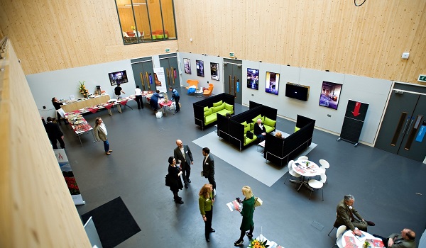The building is nestled among the campus greenery, with a footbridge over a pond providing access to a large foyer space, ideal for receptions.