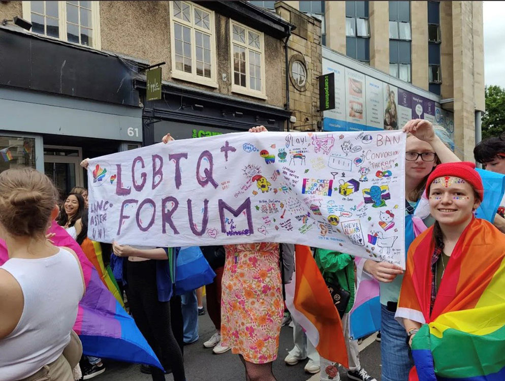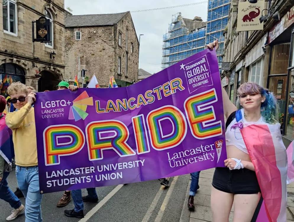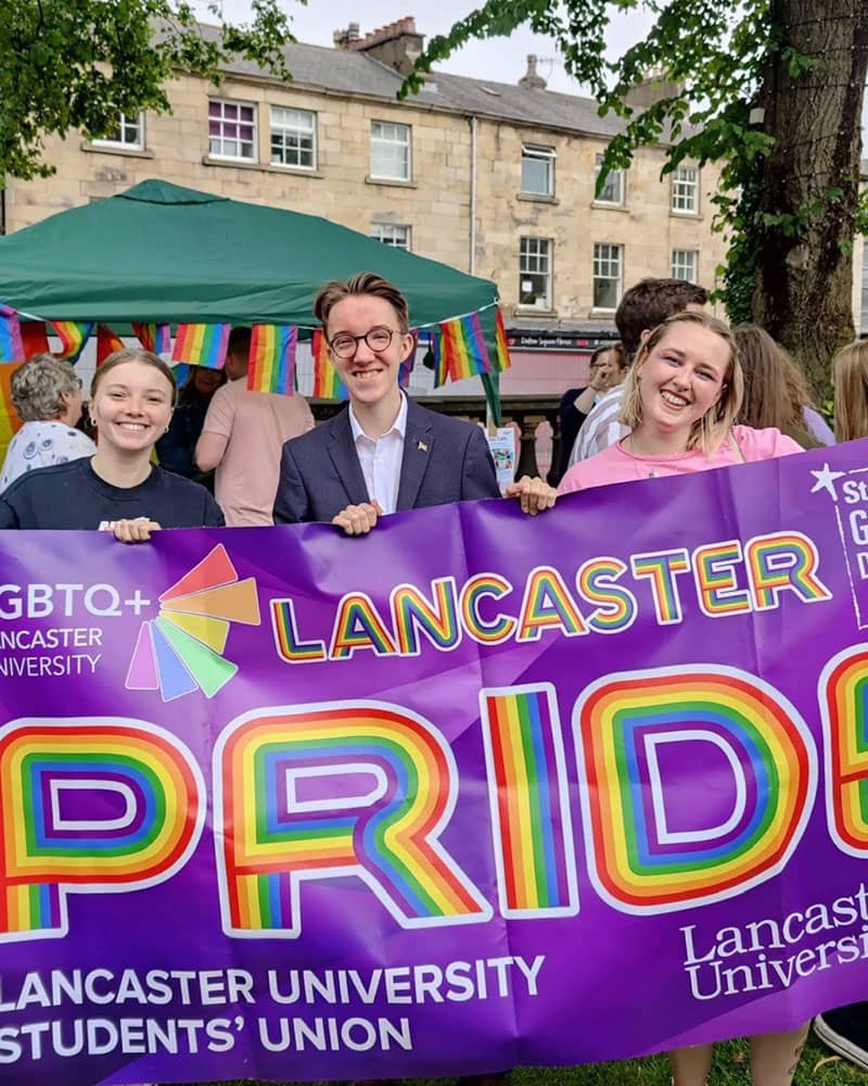 Group holding Lancaster student union pride banner