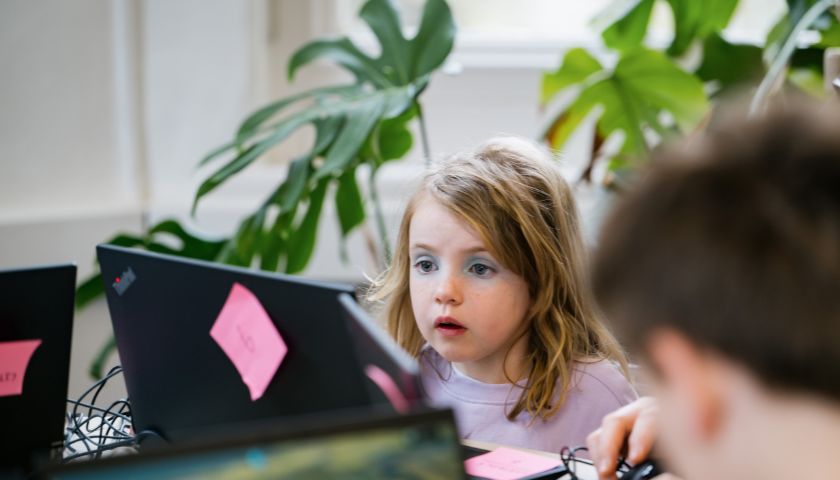 a young girl looks at a picture of a flower through an ipad screen