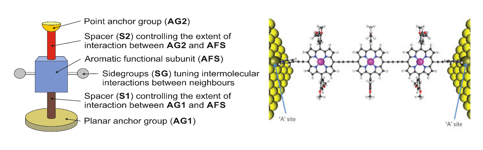 (left) Anatomy of a molecule. (right) A porphyrin-based molecule attached to gold electrodes.